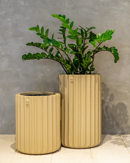 Buy Large beige planter pot online India. This tall ribbed planter can be placed in your living room, outdoor balcony, garden or even your entryway. Shipping free Pan India