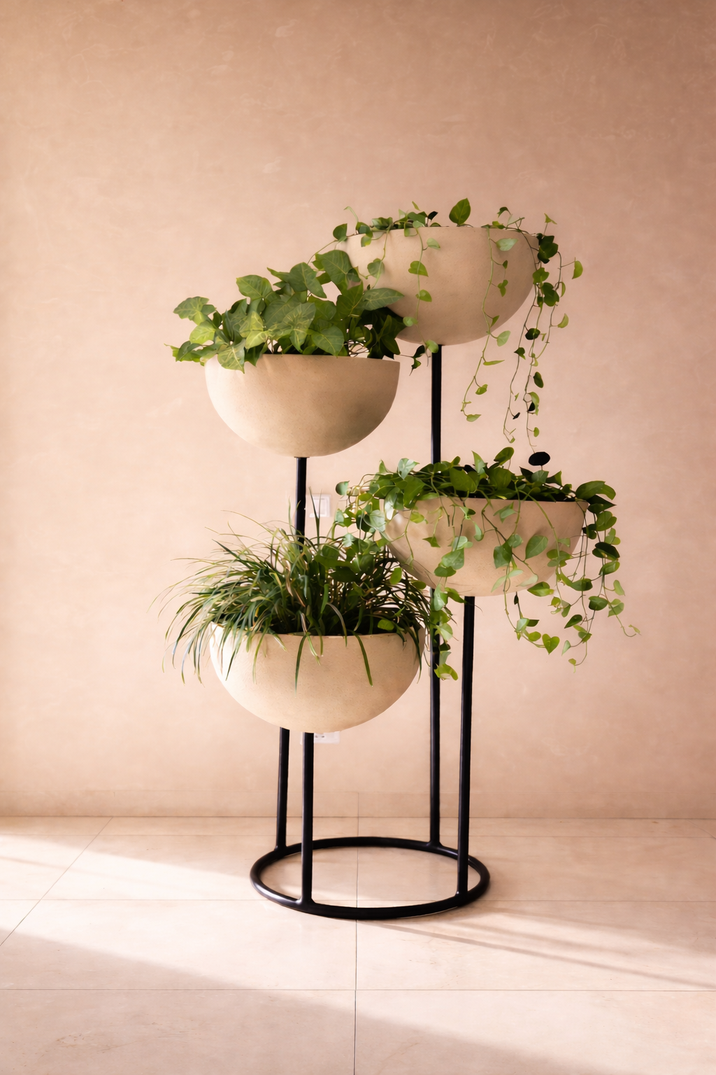 This four-tiered wonder combines sleek black metalwork with elegantly staggered ceramic bowls, creating an eye-catching vertical garden that brings movement and personality to your home.